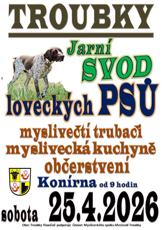 V sobotu 25.4.2026 spolupořádají troubečtí myslivci s Okresním mysliveckým spolkem Přerov Jarní svod loveckých psů.