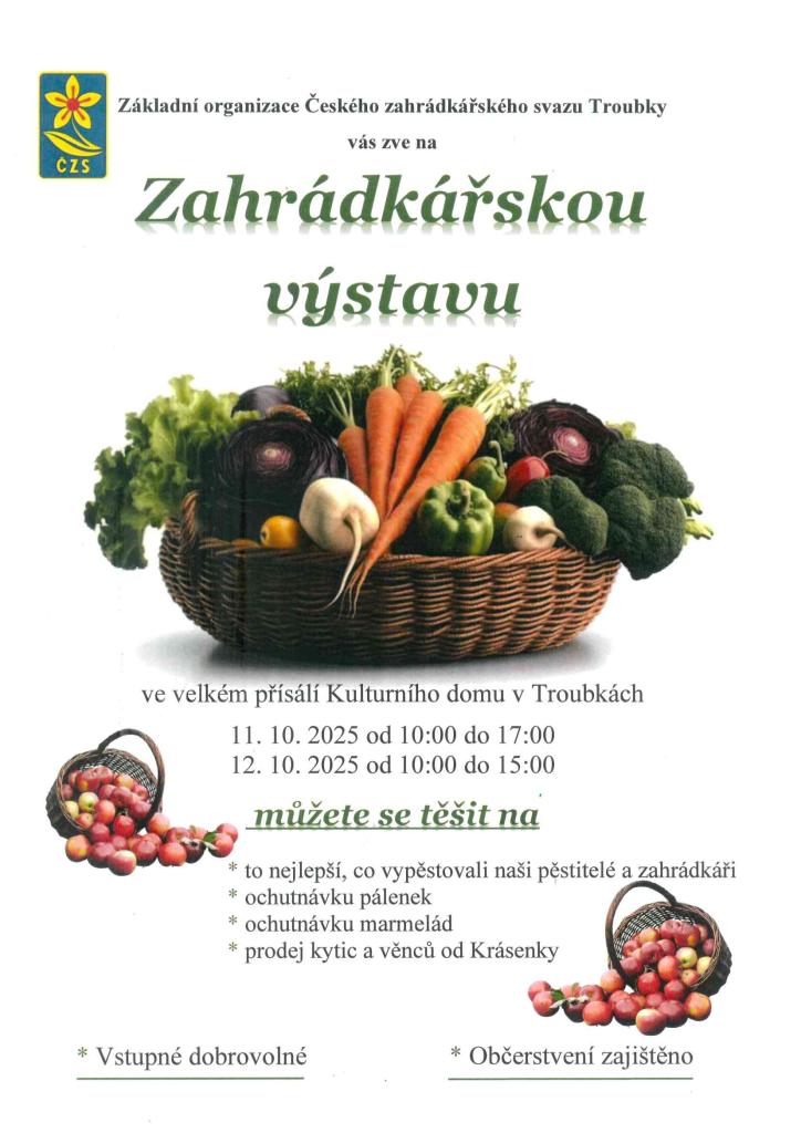 ZO Českého zahrádkářského svazu Troubky srdečně zve na zahrádkářskou výstavu, která se koná ve dnech 11.10. a 12.10.2025 na velkém přísálí Kulturního domu. Vstupné dobrovolné, občerstvení zajištěno.