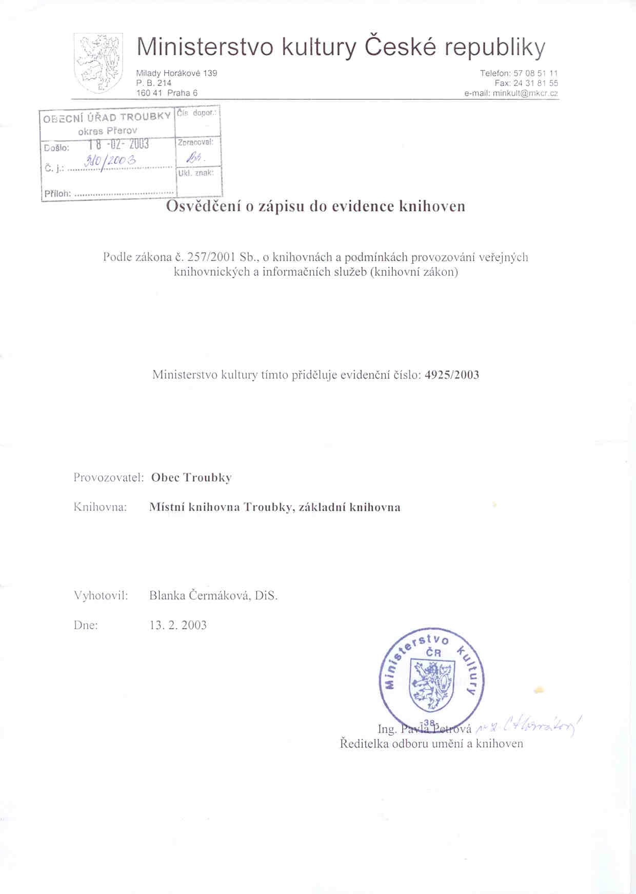 Děkujeme zřizovateli - OBCI TROUBKY za finanční příspěvky na nákup nových knih a za všestrannou podporu knihovny.